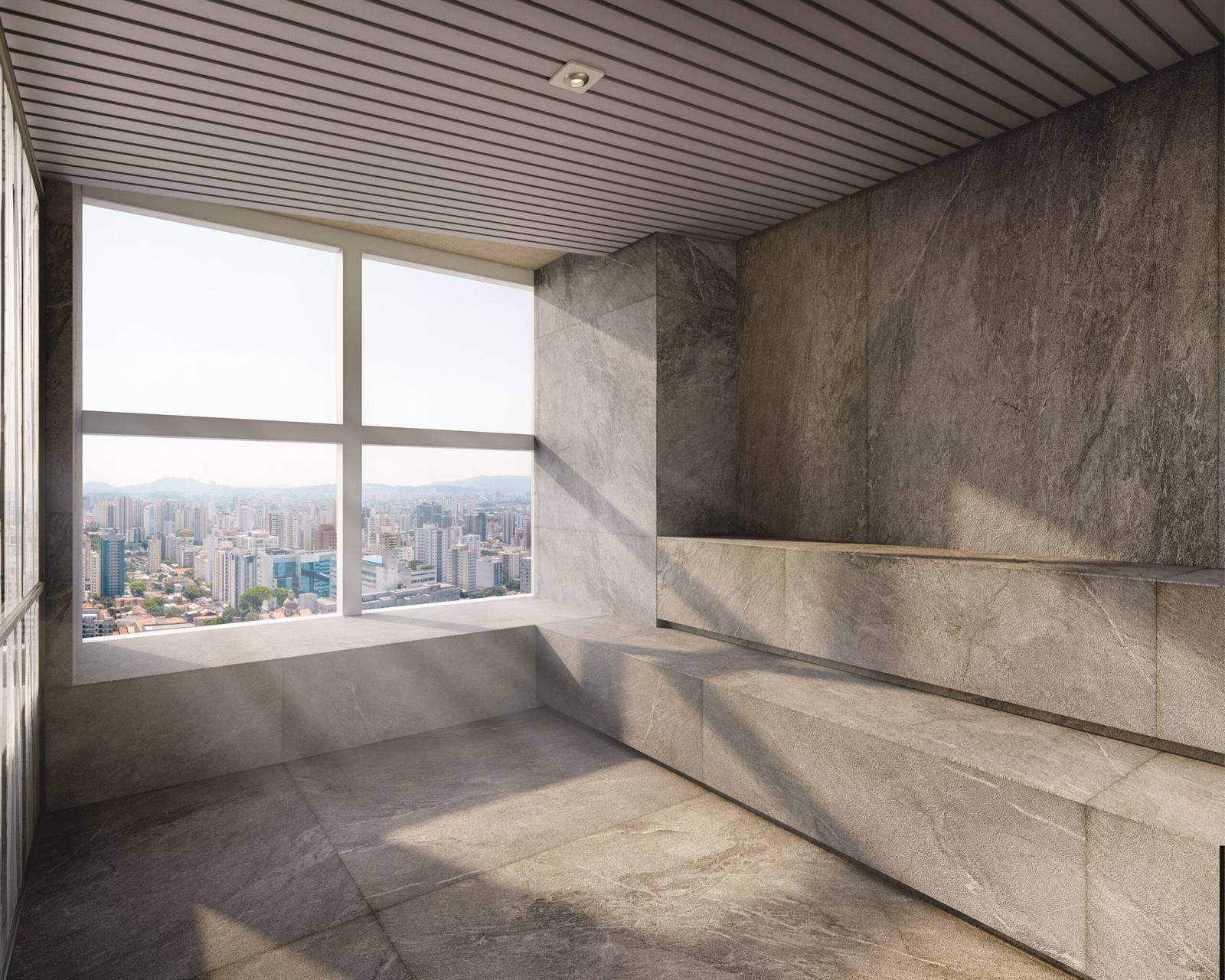 O lazer é distribuído em múltiplos pavimentos, incluindo áreas elevadas como o Sky Meetings & Lounge e o Sky Health & Spa, com espaços para trabalho, relaxamento e bem-estar a mais de 100 metros de altura. No pavimento social, ambientes como salão de festas, piscina, quadra, áreas infantis e uma academia de 148 m² completam o conjunto.