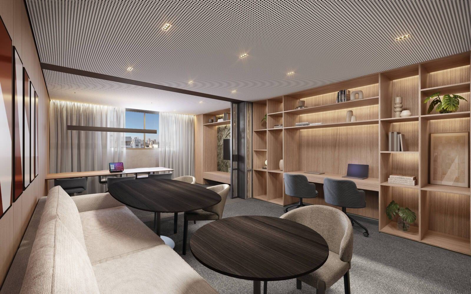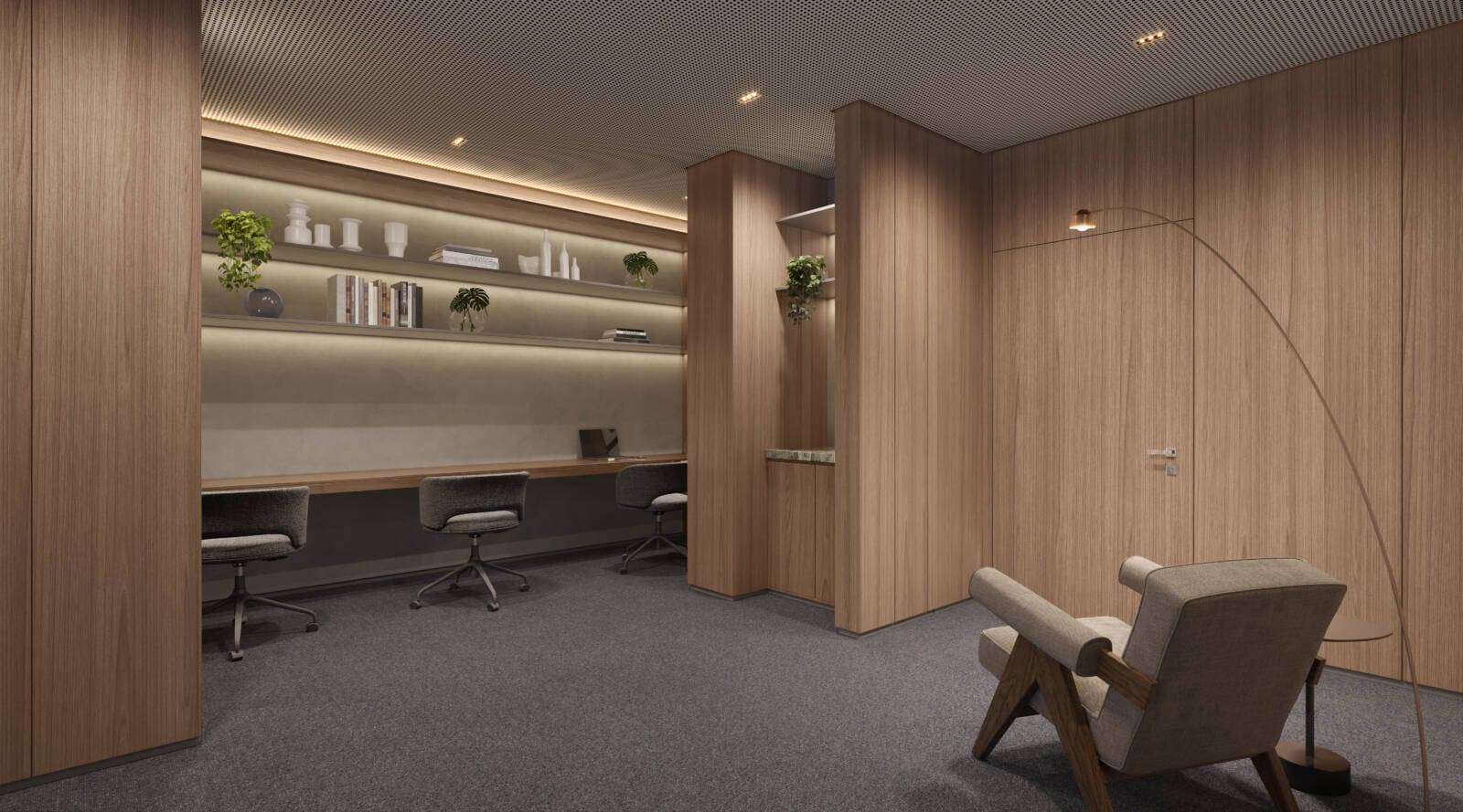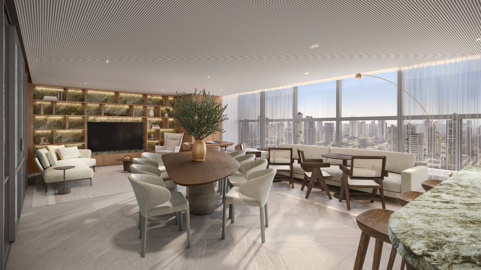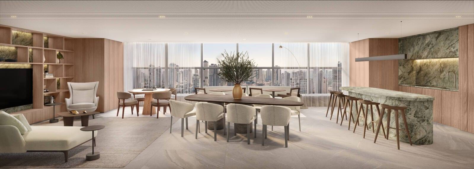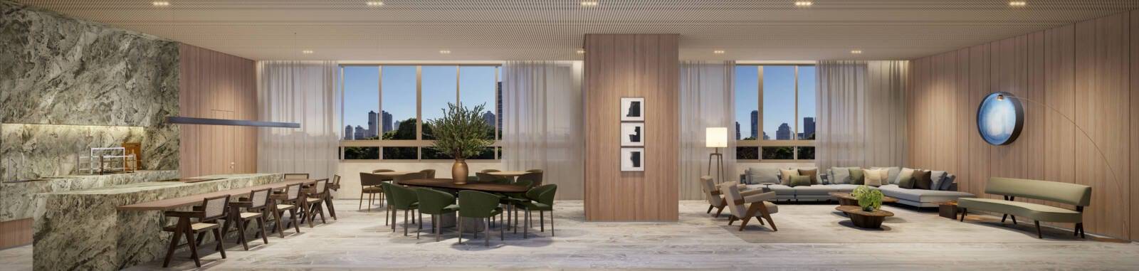 • 34º pavimento – Sky Lounge & SPA: coworking, sala de reunião, lounge bar, sauna, spa e relaxing room com vista direta para o parque.