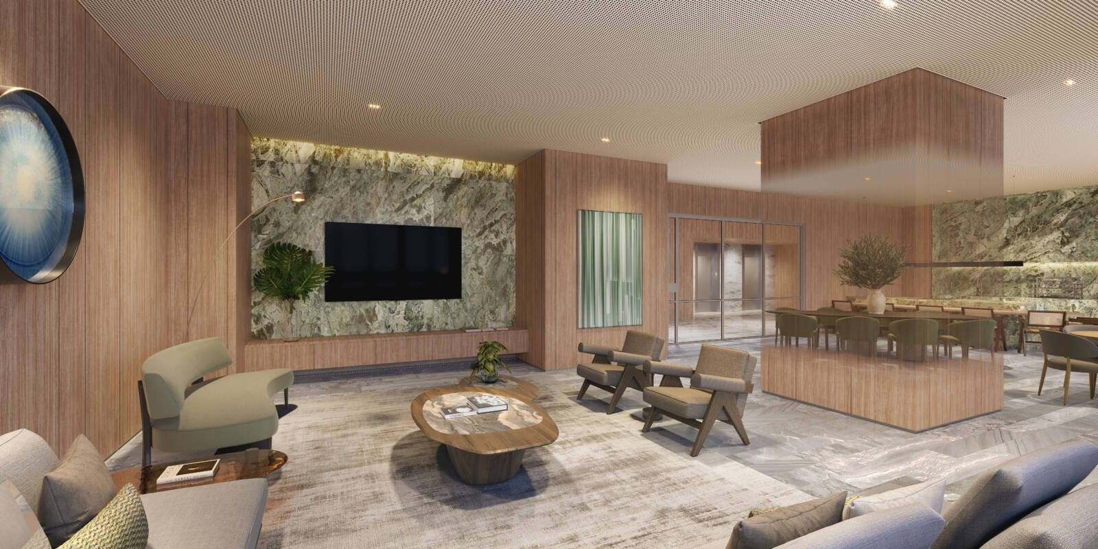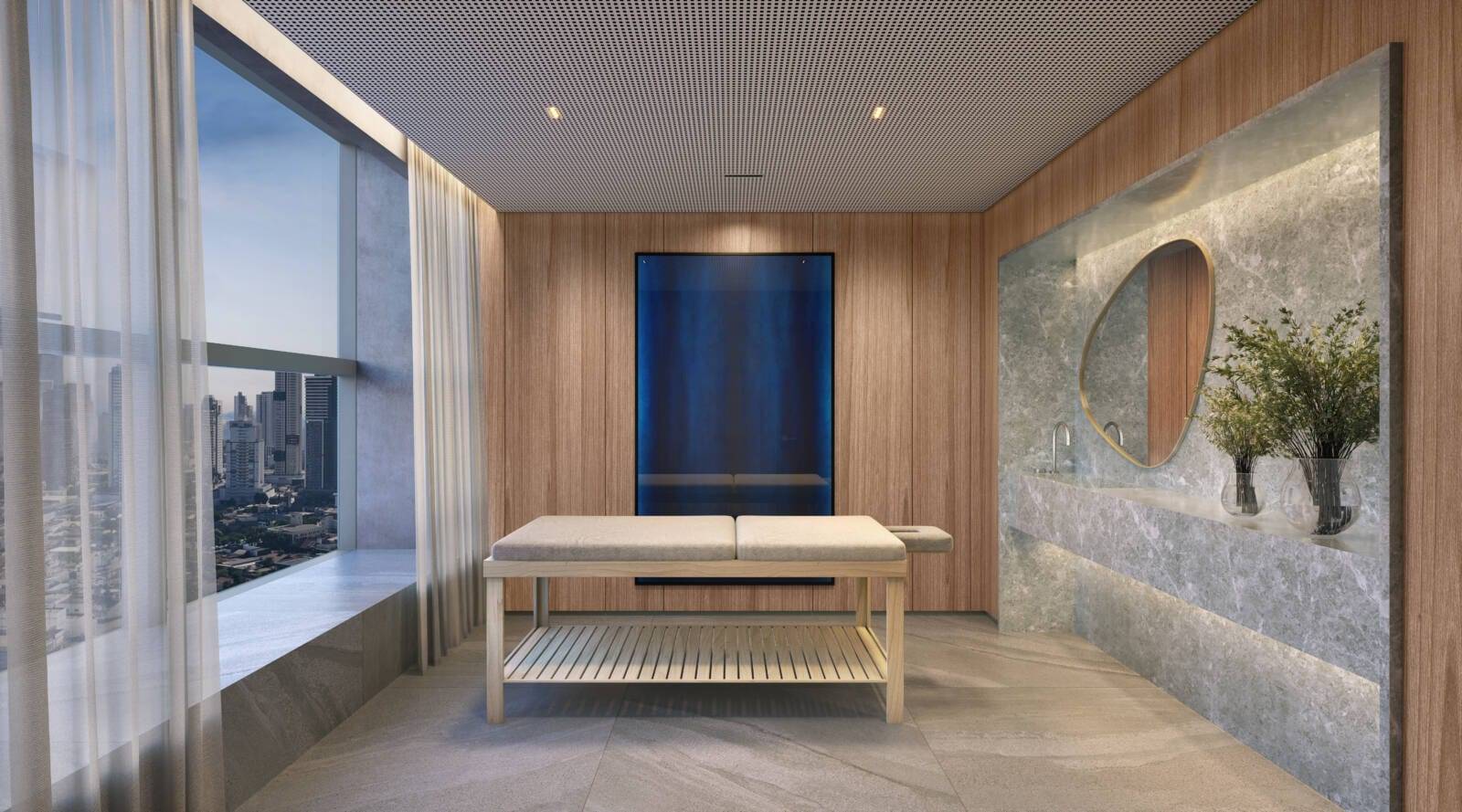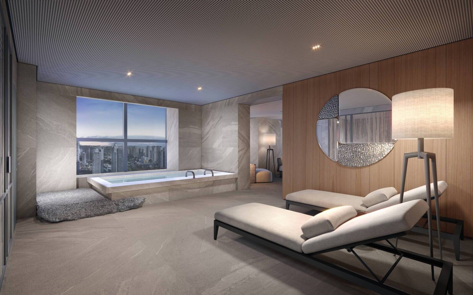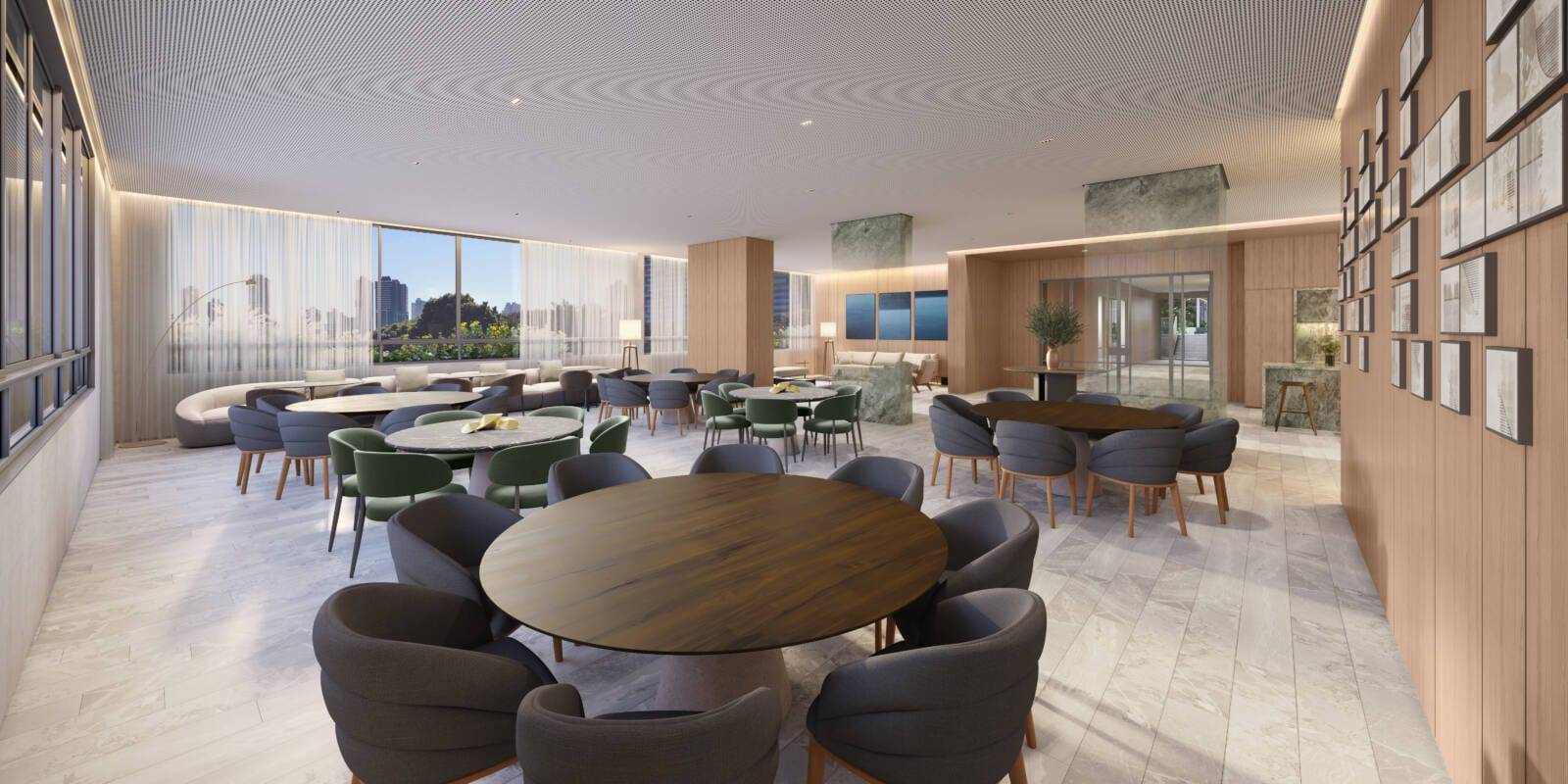 • 34º pavimento – Sky Lounge & SPA: coworking, sala de reunião, lounge bar, sauna, spa e relaxing room com vista direta para o parque.