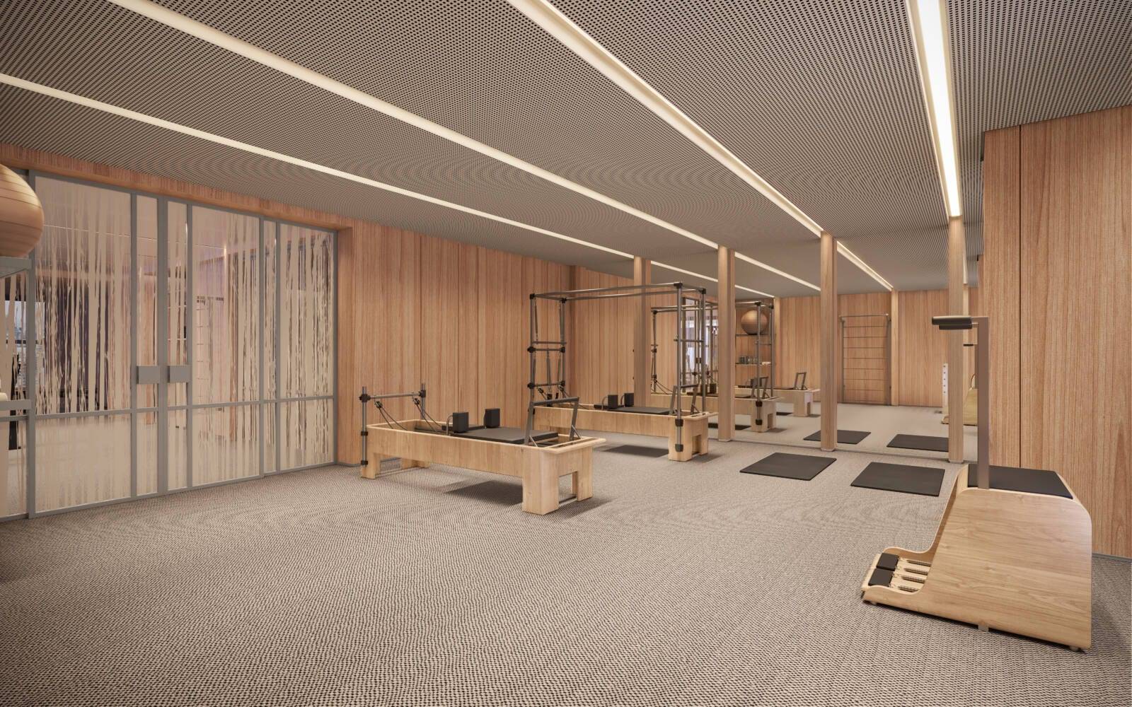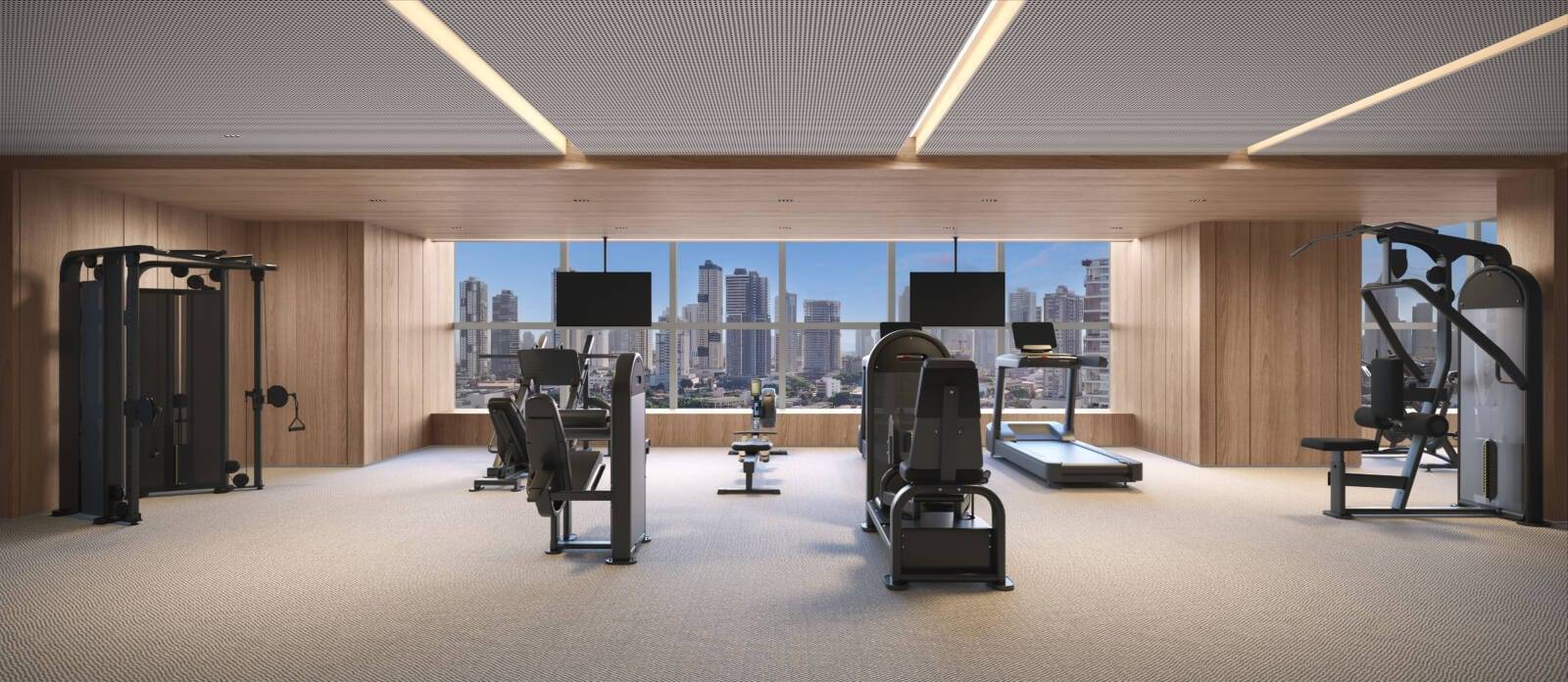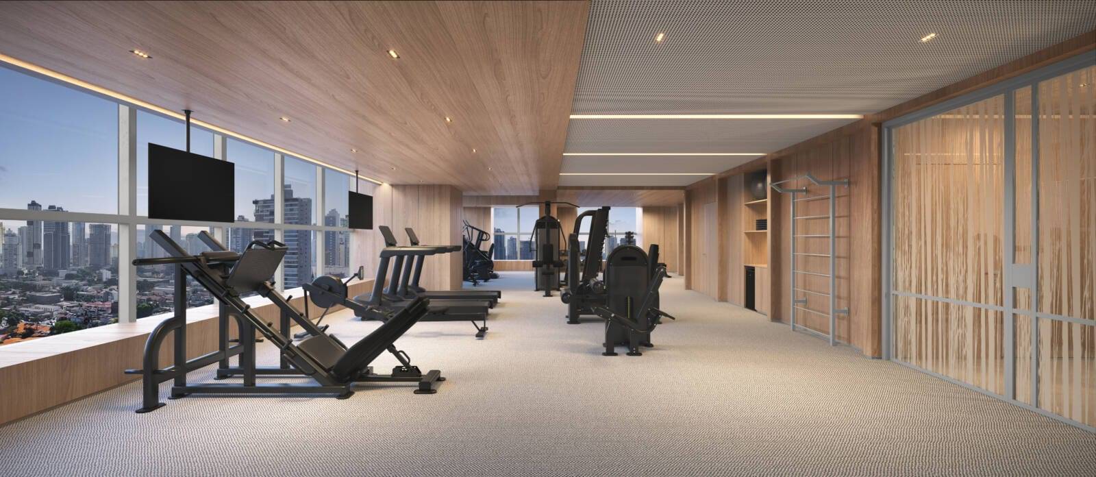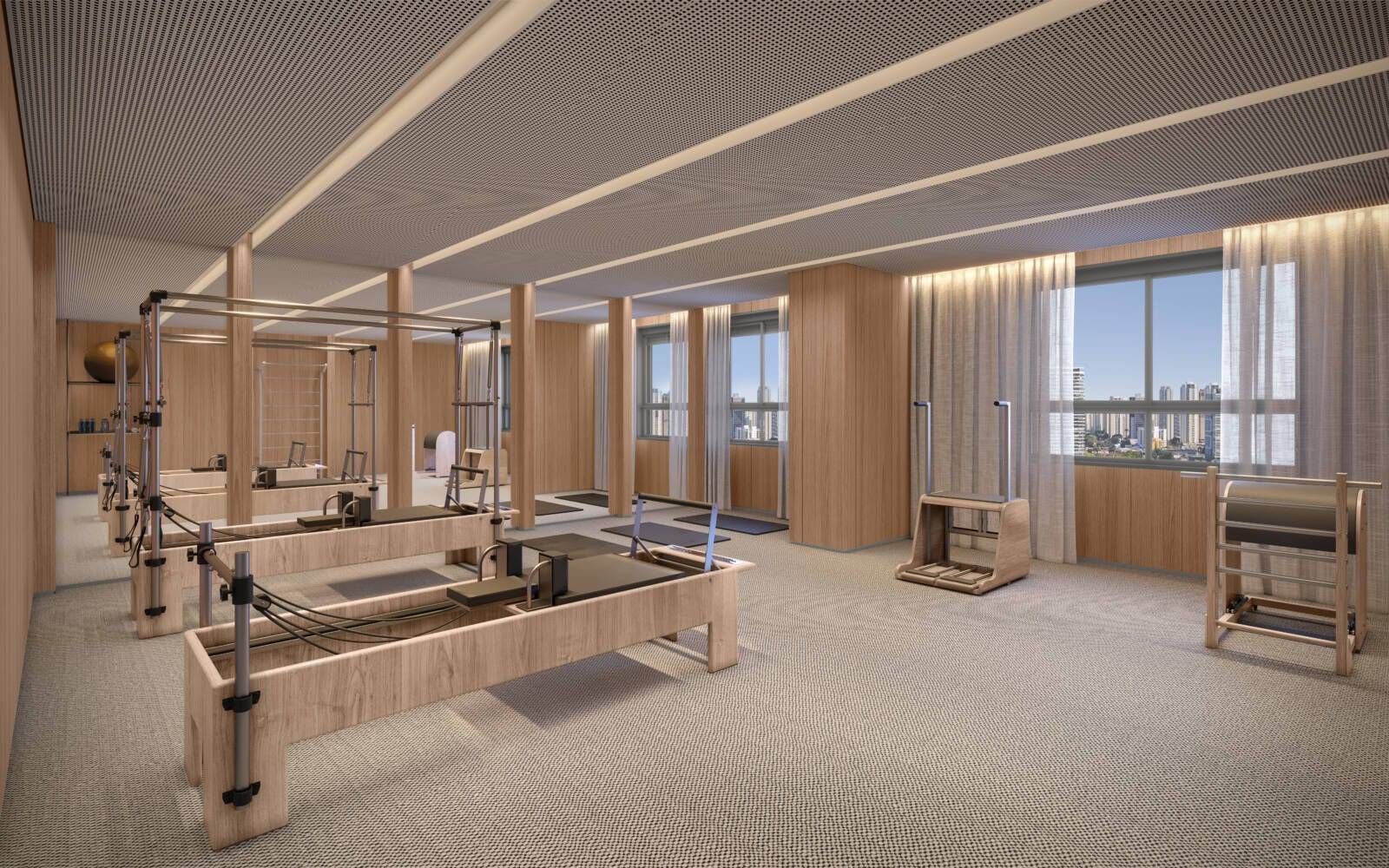 • 17º pavimento – Sky Fitness: academia de 136 m² assinada pelo Grupo Flex + Pilates Studio.