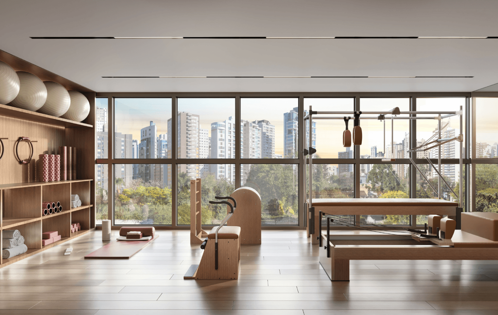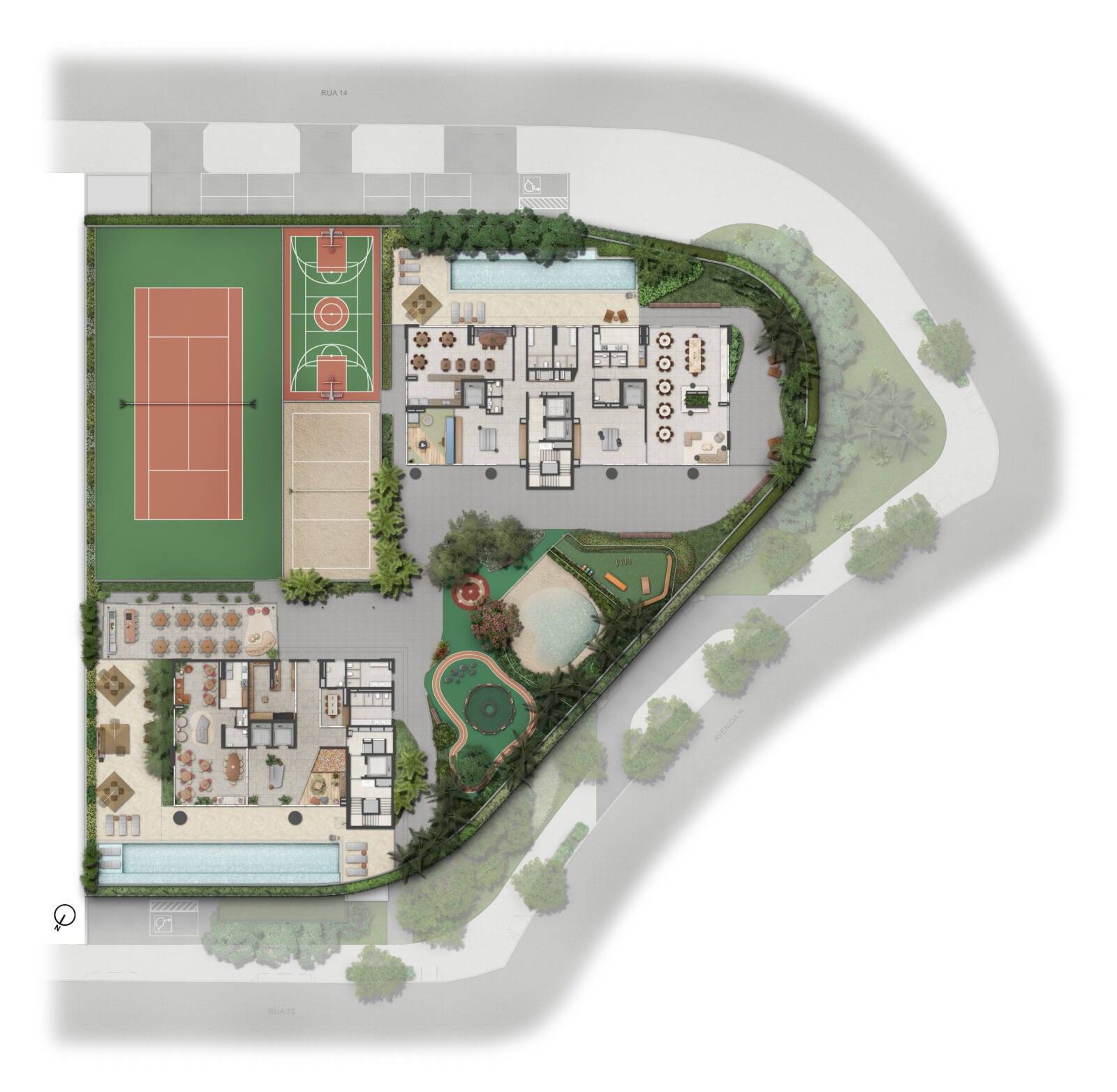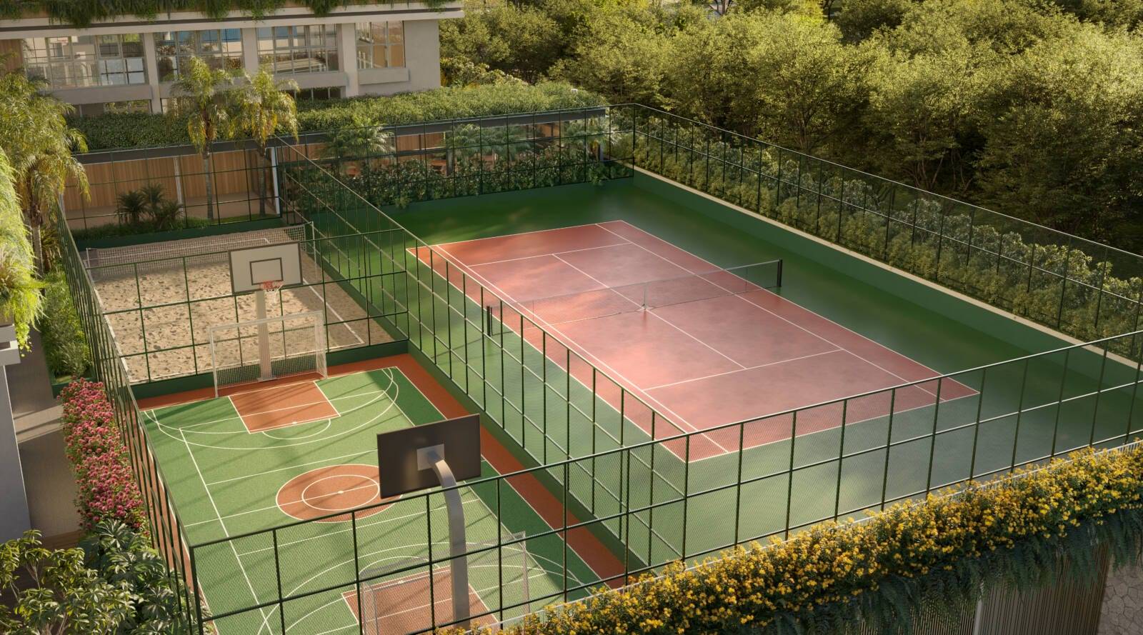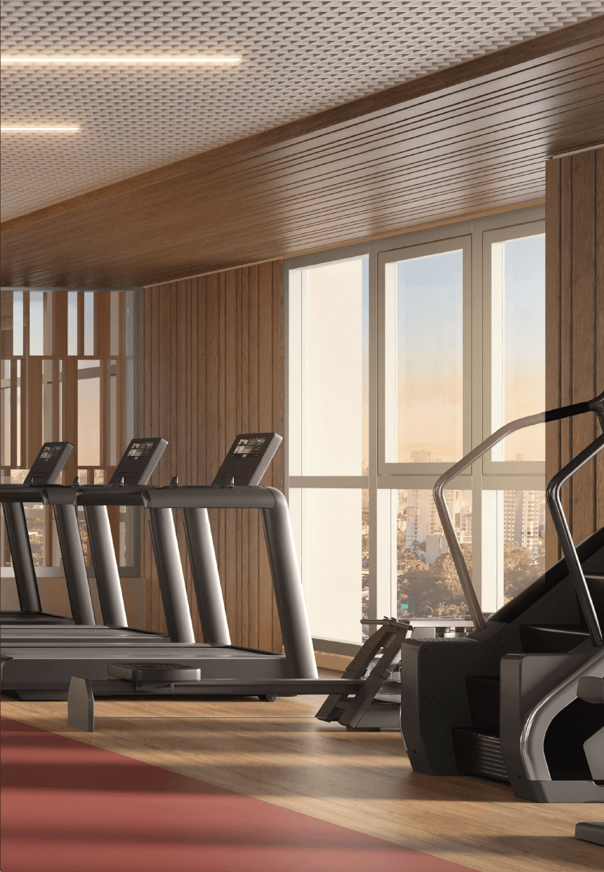 O lazer surge em múltiplas camadas: mezanino completo, espaços de bem-estar, pilates, sauna, beauty, piscina com raia de 22,50m e um conjunto esportivo com quadra de tênis oficial. No topo, os pavimentos suspensos entregam salão de festas e academia TechnoGym de alto desempenho com vista aberta.