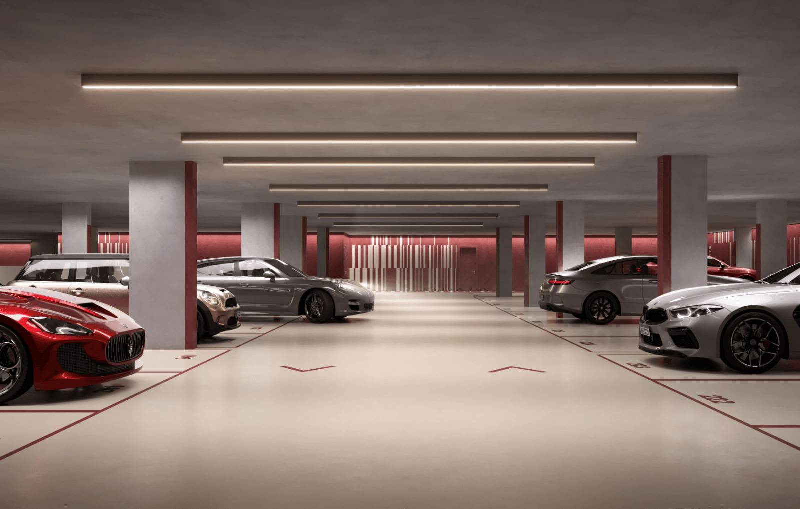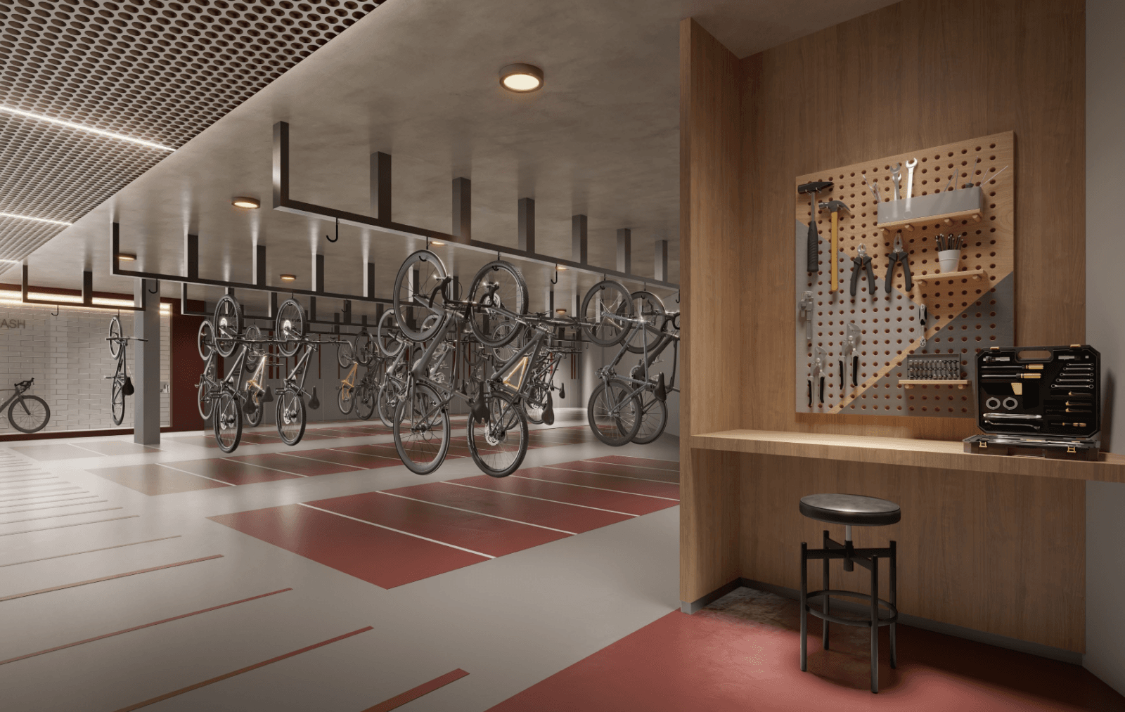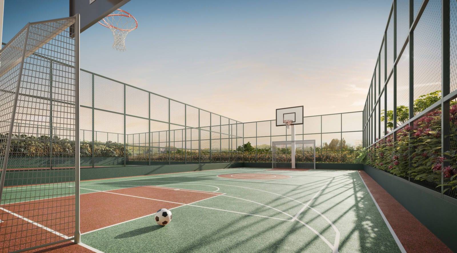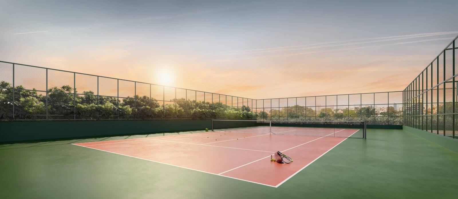 O lazer surge em múltiplas camadas: mezanino completo, espaços de bem-estar, pilates, sauna, beauty, piscina com raia de 22,50m e um conjunto esportivo com quadra de tênis oficial. No topo, os pavimentos suspensos entregam salão de festas e academia TechnoGym de alto desempenho com vista aberta.
