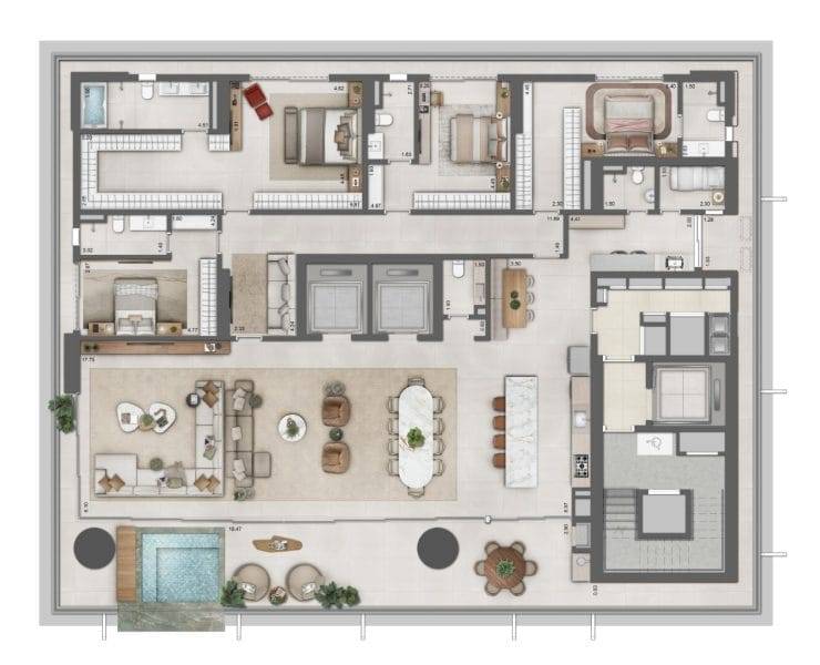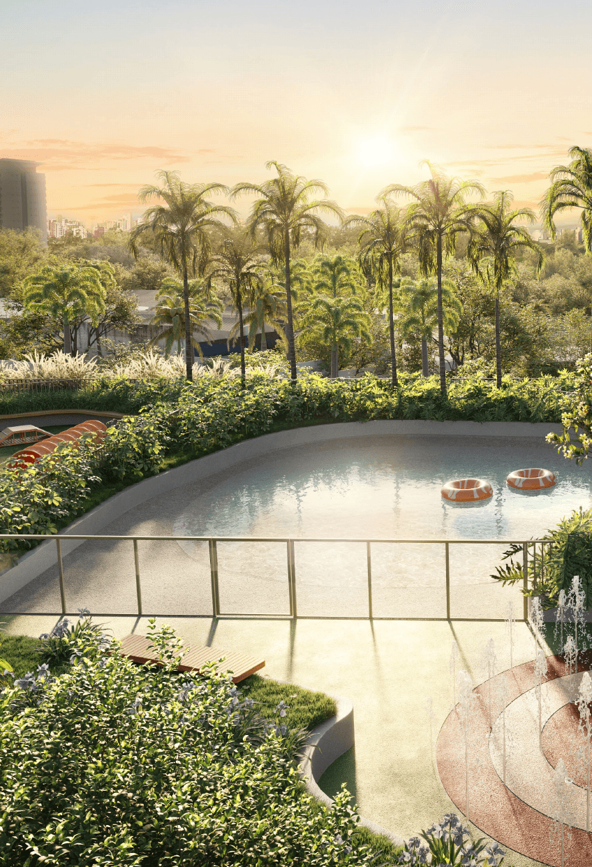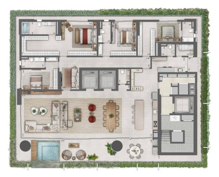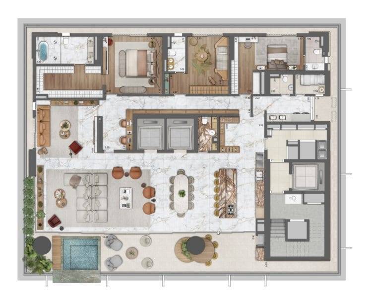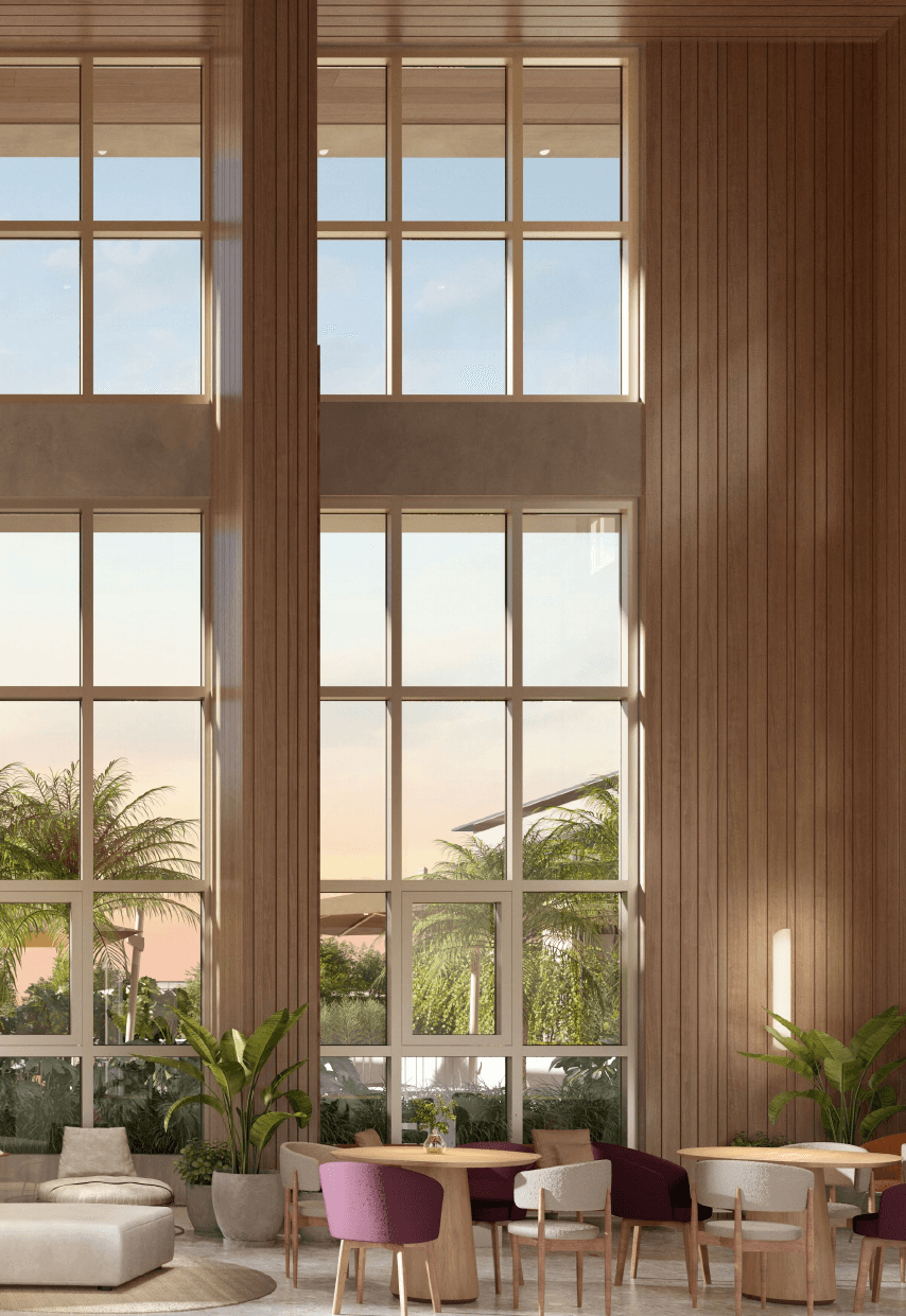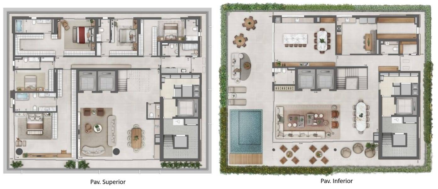 Os apartamentos de 420m² trazem 4 suítes, pé-direito elevado, aberturas piso-teto, ventilação natural, brises de proteção solar e varandas com piscina opcional. Cada unidade privilegia conforto, privacidade e uma experiência de morar que não se repete.